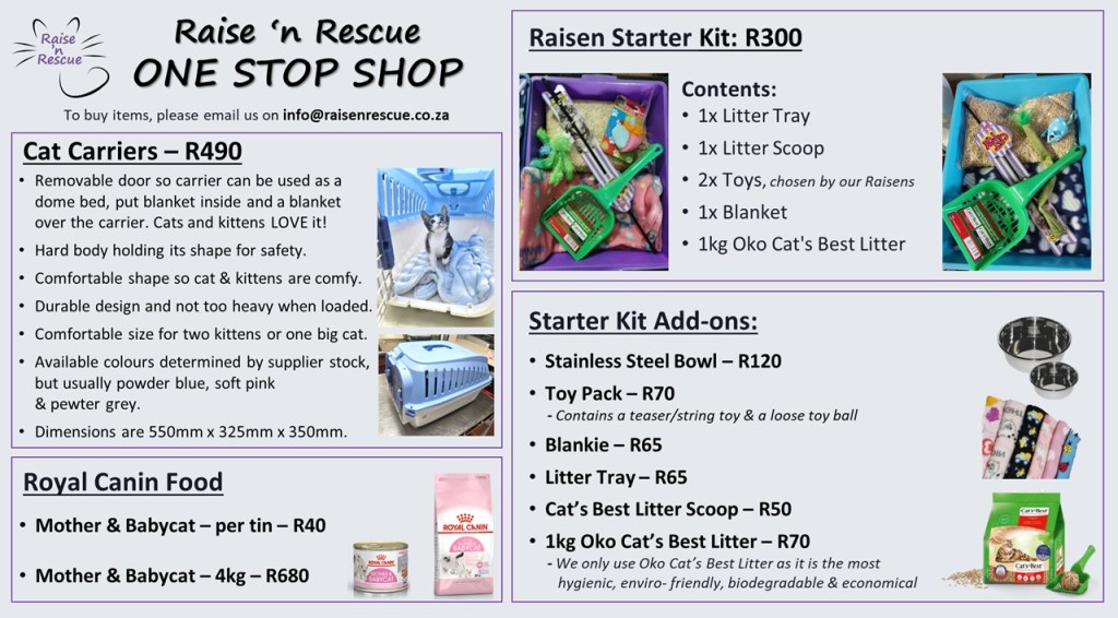 Whilst we truly understand that adopters are generally in a hurry to get their kittens home, we appreciate that you understand we can only send them home once they are ready. When a kitten is healthy and the ideal sterilisation weight of 800g, then they will get sterilised and soon after that we send out the collection emails. Because our kittens’ readiness is not determined by age, but by weight, we cannot give an estimation of time as we are dependent on a kitten’s biology. Kittens also need to remain in care with their siblings and mother (where possible) to learn certain very important behaviours so they can be well adjusted cats in their new homes.