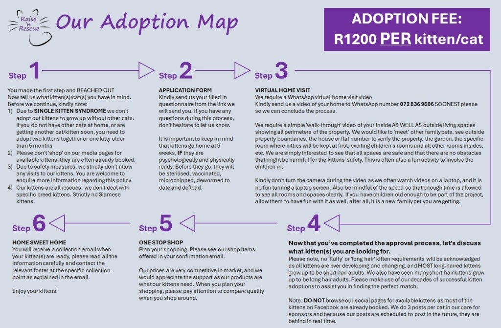 - Contact us on Whatsapp 072 836 9606 only (strictly no calls), once you confirm you wish to adopt a kitten/cat.